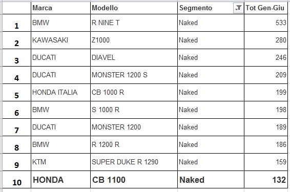 (solo le moto) l'ho messa su excel, ho tolto tutte le moto che non siano naked, e che non siano almeno 1000 e questo è il risultato: