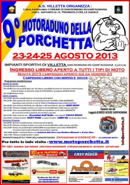 Questo week-end a Villetta san Romano in Garfagnana (LU) si terra' il 9° motoraduno della Porchetta, una bella occasione per fare tante belle curve e visitare un posto nuovo.