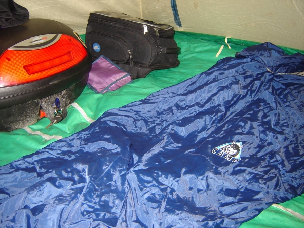 La notte è tranquilla, la mattina invece tra gli aerei che atterrano e decollano a poche centinaia di metri dalla tenda, le campane della chiesa sull'altro lato, i militari di una vicina caserma che suonano trombe, urlano e stonano l'inno di Mameli... mi passa il sonno e mi alzo molto presto. In qualche modo mi lavo con l'acqua ghiacciata che abbiamo a disposizione ed inizio ad impacchettare la mia roba. A metà mattina tornano Rugge72 con l'amico Benellista ed un amico Harleysta, oltre alle belle Ripley e... sorpresona! La mitica Bagheera!