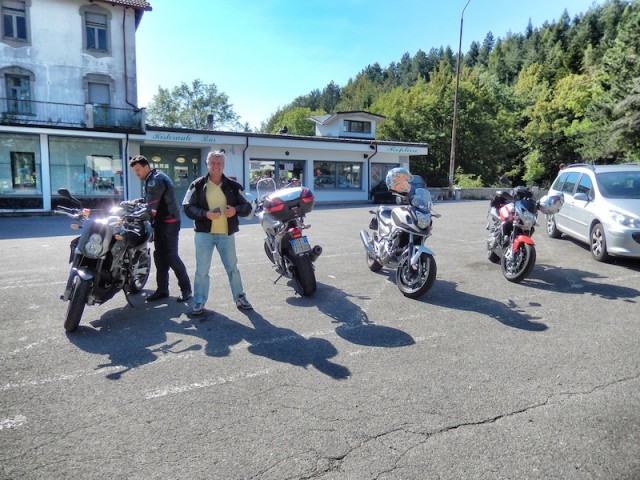 Scendiamo dal passo alla volta di Bobbio e della Val Trebbia: la strada da pieghe più famosa d'Italia (sia tra i motociclisti che, purtroppo, tra le forze dell'ordine che per fortuna non abbiamo incontrato) non tradisce le aspettative e, a passo allegro, ci conduce verso la liguria. A Torriglia ci fermiamo per un attimo di ristoro, mi avvento su una fetta di torta poiché il calo di zuccheri si stava facendo sentire e qualcuno segue il mio "buon esempio".