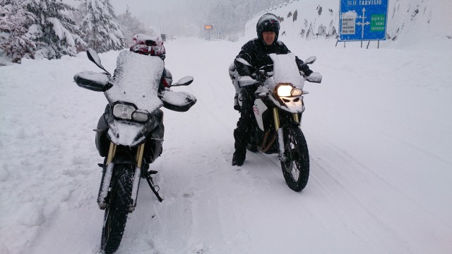 Passato Gemona la A23 si è fatta via via più candida e all'uscita di Pontebba un omino in tenuta arancio delle autostrade ci ha bloccato ed invitato ad uscire....(solo le moto)....