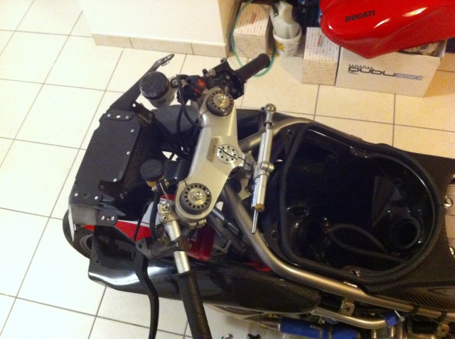 Airbox: buona costruzione, ma diverse imprecisioni. Il mio non combaciava perfettamente con le 6 viti di fissaggio, accostando (non serrando) le 2 viti subto dietro al vaso d'espansione del liquido radiatore e quelle davanti alla sella, rispetto ai fissaggi centrali la fibra di carbonio era 12-15 mm più in alto. Ho dovuto inventarmi qualcosa per chiudere il tutto senza rompere niente.