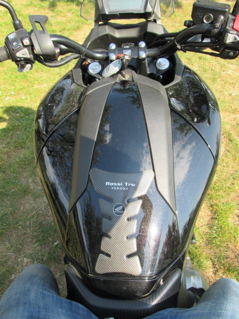 Qui la moto è vista da sopra e se notate il paramotore non si vede e non interferisce con le gambe durante la guida. Io sono alto 1,87 e in nessun caso ci ho mai preso dentro, nemmeno stando seduto attaccato al finto serbatoio.