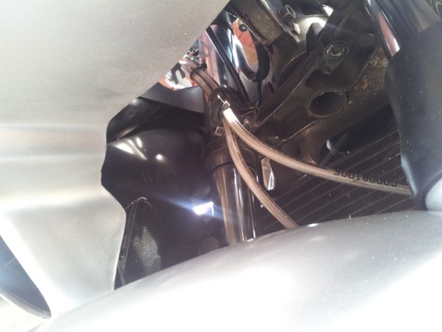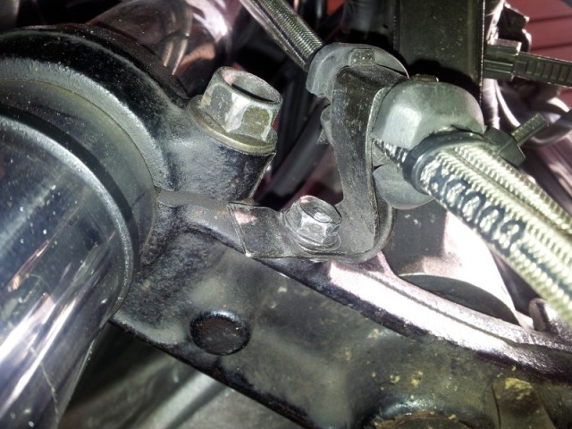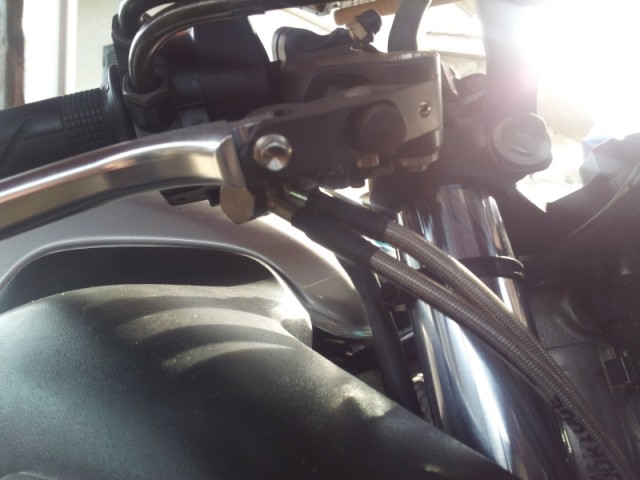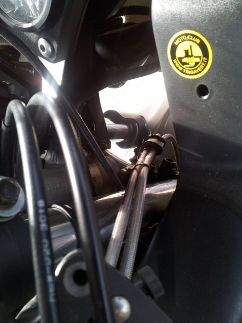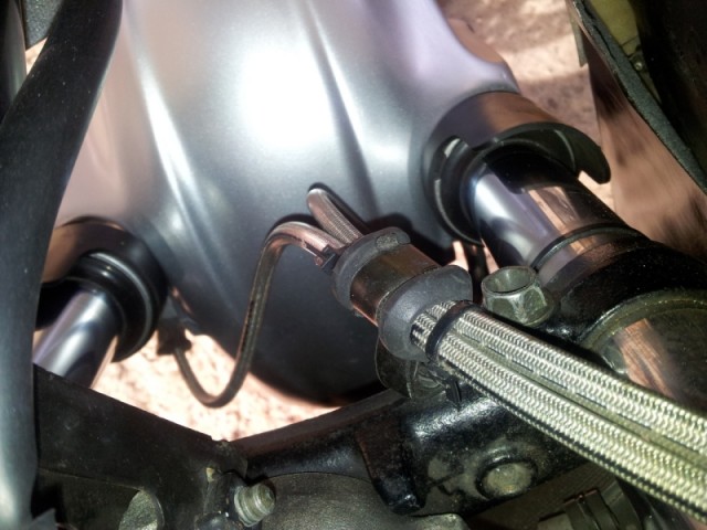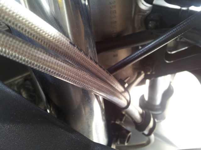 Come sopra, però qui si vede meglio il blocco che tiene fermi i tubi, è quello dei tubi originali adattato per far passare i 2 tubi in treccia