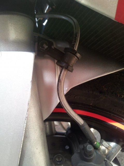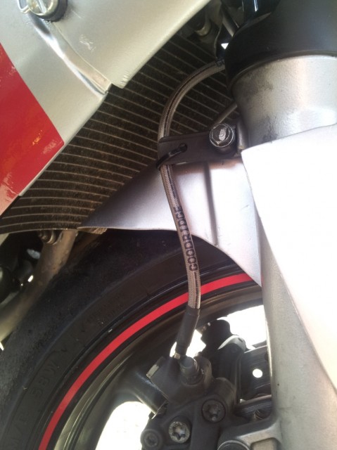 Il tubo in treccia alla pinza sx, qui visto che c'era ho utilizzato il supporto tubo originale.