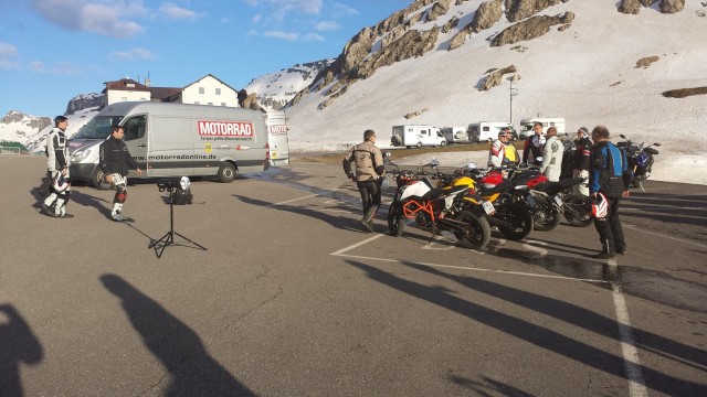 Sul Passo Pordoi troviamo il gruppo di giornalisti che stanno partecipando all’ ALPEN MASTER 2014. Uno spettacolo di moto. Facciamo un po’ di foto e quattro chiacchere, tutti davvero simpatici e disponibili (ma vi sembra giusto che ci sia gente che per mestiere DEVE GUIDARE MOTO??? Eh che cavolo!!!). Poi ripartiamo tutti alla spicciolata verso valle. Bene, se qualcuno vi dice che una moto turistica, diciamo Yamaha FJR, è poco adatta alle nostre strade di montagna ma serve solo per le autostrade Tedesche, allora non ha mai visto guidare uno di questi signori (e signore).