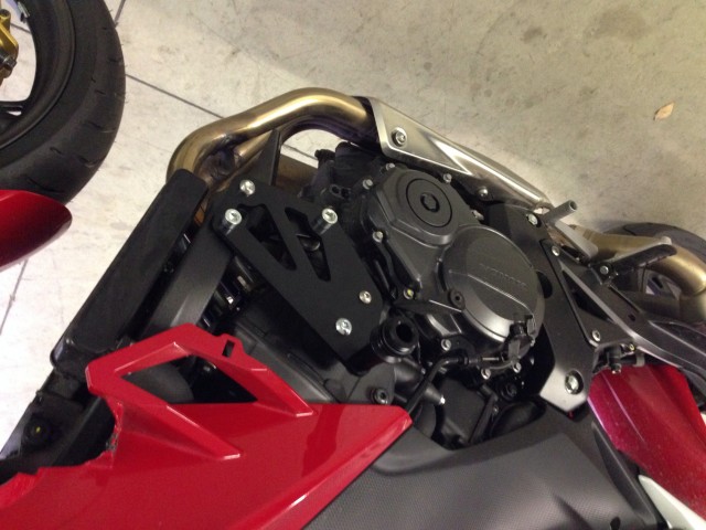 Ora dovrei fissare queste staffe al telaio e al motore con 3 grosse viti (per lato) che sostituiscono le viti originali con cui il motore è appeso al telaio....