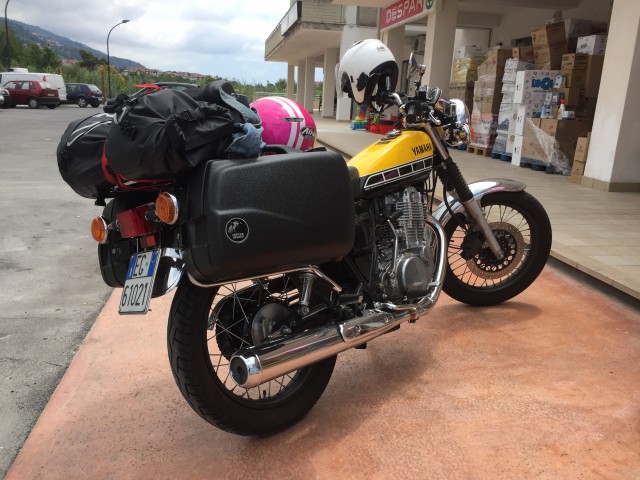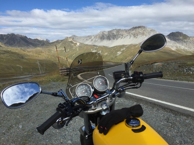 Settimana scorsa ho fatto una puntata in solitaria sullo Stelvio, prima di fermarmi a Caspoggio per fare rifornimento di pizzocheri. Per quanto il motore fiacco non aiutasse molto nei tornanti più ripidi sono riuscito a salire senza problemi, e una volta in cima è iniziata la solita teoria di domande e sguardi incuriositi; quando è stato il momento di ripartire avevo intorno cinque persone che mi fissavano nel mentre che scalciavo come un dannato (maledetta altitudine) per accenderla.