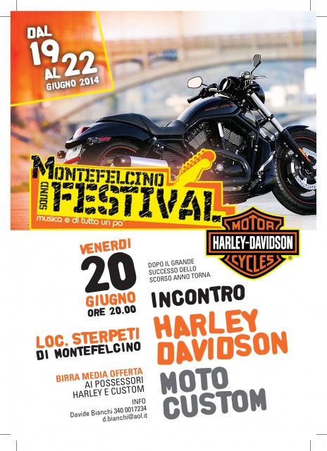 Dopo il successo degli anni precedenti, VENERDI 20 Giugno alle 21 a Sterpeti di Montefelcino ( metà strada tra Fano e Fossombrone sulla Flaminia)in provincia di Pesaro-Urbino, nell'ambito di una manifestazione chiamata "Montefelcino Sound Festival" torna la terza edizione del ritrovo di moto Harley Davidson e Custom in generale.... per chi verrà su una di queste moto ci sarà una Birra media in Omaggio.