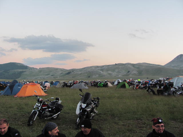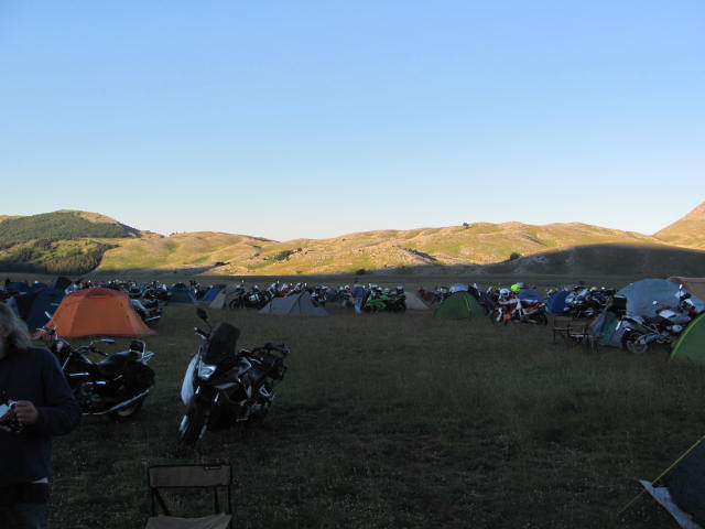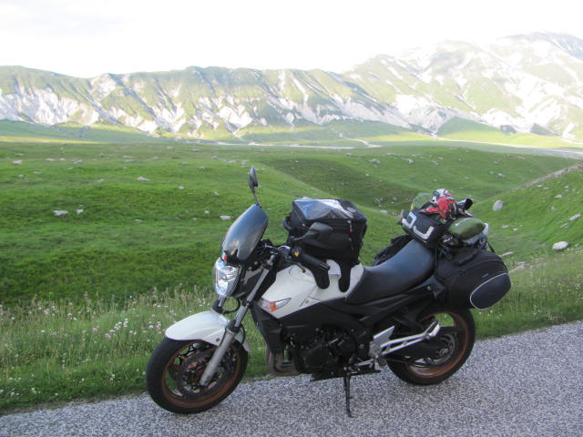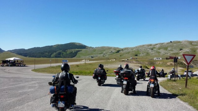Anche qui scenari stupendi, ma l'asfalto chiaro che impedisce di vedere bene sabbia e sassi non aiuta a godersi strade e panorami contemporaneamente. Arrivati in cima a Campo Imperatore non troviamo nulla a parte qualche motociclista che fotografa e osserva il paesaggio... chiediamo e nessuno sa nulla del Weekend da Lupi