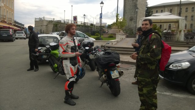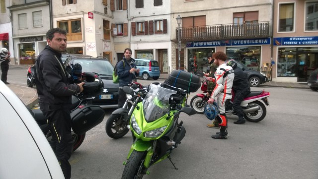 Intanto si discute sul fatto che naco è in ritardo e decidiamo di aspettarlo all'ombra degli alberelli del parcheggio; ci mettiamo comodi, qualcuno ( ) fa anche spuntino, parliamo delle nostre moto (e con un pezzo di storia come una GPZ è impossibile non dire nulla) sembriamo già arrivati su un passo dopo km di salite, partiamo bene! anzi no, non siamo ancora partiti