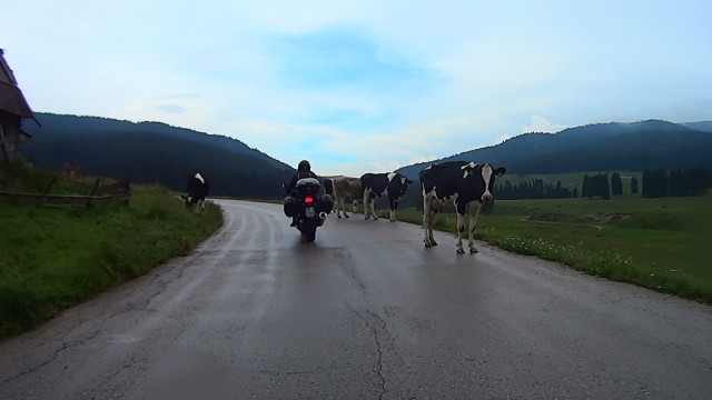 e non per confondervi le idee, ma solo perché ho organizzato ad capocchiam le foto/filmati, un incontro ravvicinato con rari esemplari di " mucca alpestre", appena usciti dalla malga che c'era, ma non si sapeva dove . notate il bagnato e i prodotti dei quadrupedi che rendevano ancora più infido il percorso