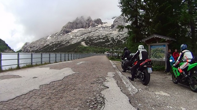 Scendiamo dal Rolle, e visto che il tragitto originale è già stato completamente sconvolto e non smette di piovere, decidiamo di andare direttamente verso l'albergo nel modo più veloce e meno rischioso, proseguendo lungo la valle per Predazzo, Moena e Canazei.