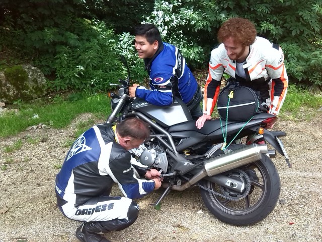 Vedo decine di moto passare ma nessuno che si ferma con fare di chi mi sta cercando; ad un certo punto intravedo tra i cespugli dei motociclisti fermi vicino al guard rail, risalgo in moto e mi avvicino: mi riconoscono e alzano le braccia, ok sono loro!