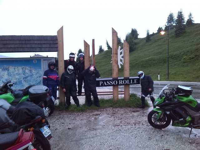 Sotto una pioggia costante arriviamo sul Passo Rolle, foto d'obbligo da poter mostrare un giorno ai nipotini, e a chi non ha il coraggio di partire all'avventura mi viene da dire che sono cose da provare, soprattutto se si è in un gruppo cosi!