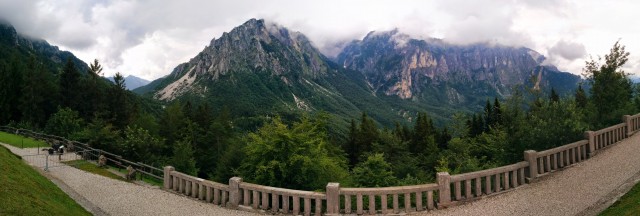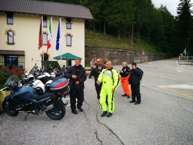 L'acqua alla fine la prendiamo in Vallarsa, ma solo per un quarto d'ora, tantè che arrivati all'Ossario del Pasubio dopo Pian delle Fugazze ci togliamo gli antipioggia e approfittiamo per una pausa aperitivo.