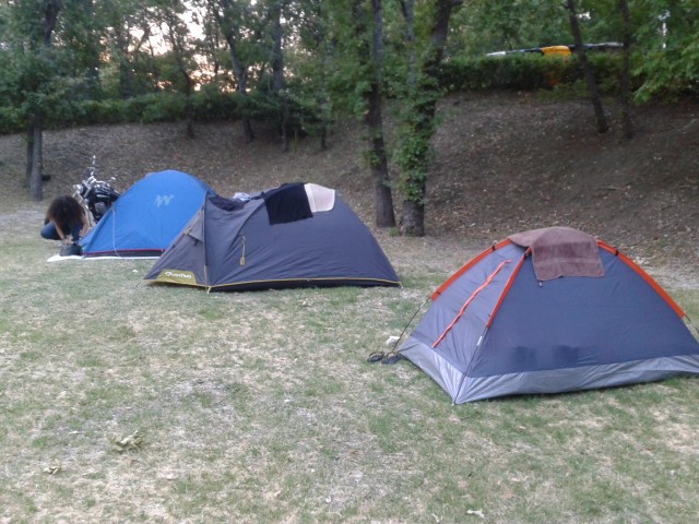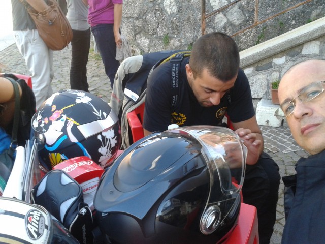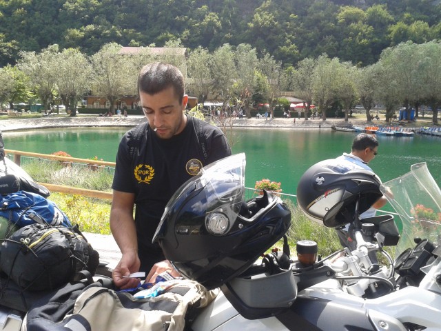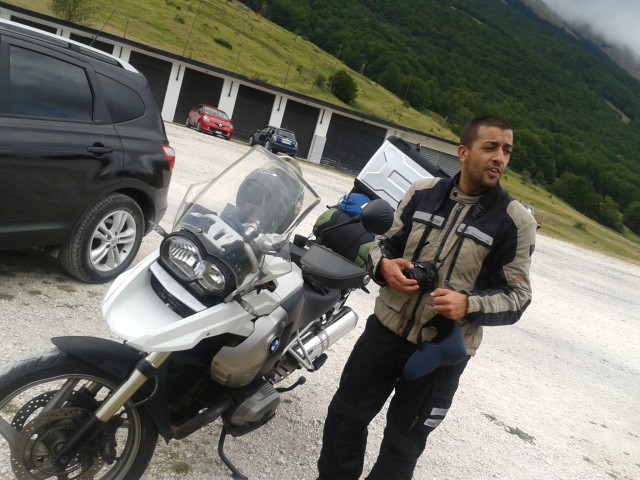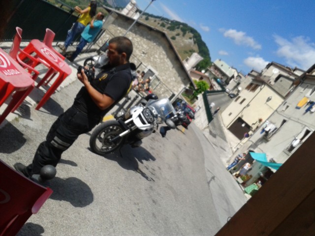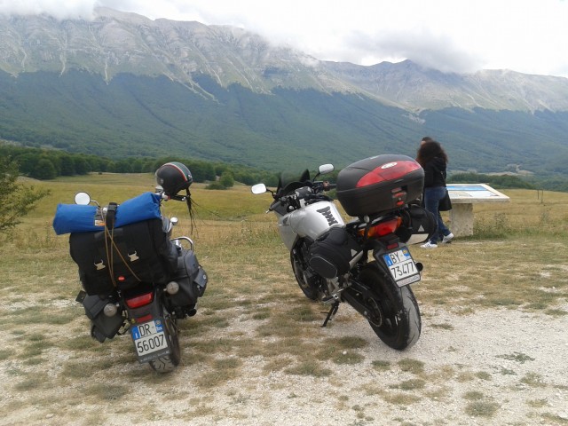 Partiti col sole, abbiamo attraversato il Parco Nazionale d'Abruzzo da Pescina a Pescasseroli (primo Passo, quello del Diavolo), proseguendo poi verso Opi e Villetta Barrea. Da qui siamo arrivati a Scanno attraversando il Passo del Godi. Strada bellissima e ben tenuta. Poi scendiamo attraverso le Gole del Sagittario in direzione Ateleta (la strada è magifica!). Cercare la direzione da queste parti è un'impresa: le segnalazioni sono pessime e divaghiamo per un attimo in una strada di campagna cercando la statale che porta verso Roccaraso. Le strade dopo Roccaraso peggiorano, nel senso che il manto stradale è proprio bruttino e proseguiamo per qualche km tranquilli, tra buche e brecciolino (siamo al confine tra Abruzzo e Molise). Arrivati a Bomba installiamo il ns campo base, vicino al "Motociclista Solitario" che ci accoglie dandoci consigli su ogni cosa (aò ma sa tutto lui..