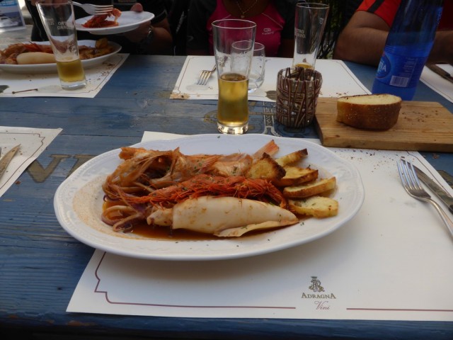 Scesi a Milazzo, sistemazione delle moto in un garage, doccia e ottima cena vicino al porto.