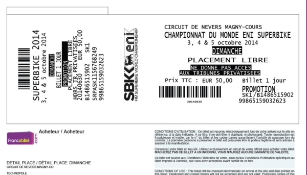 | Note: causa imprevisto vendo 2 biglietti per SBK, domenica 5/10 a Magny Cours, in tribuna. Costo attuale per 2 è 150 euro, cedo a 40 euro entrambi. | |