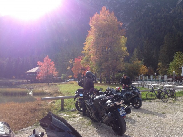 Pazienza saliamo, le condizioni cambiano continuamente, piove non piove, la strada e' dapprima bagnata poi umida, poi asciutta, sta' di fatto che saliamo l'ultima parte del Fadalto, il lago di Santa Croce e fino a Belluno, con un grip insperato, divertendoci come dei bambini.