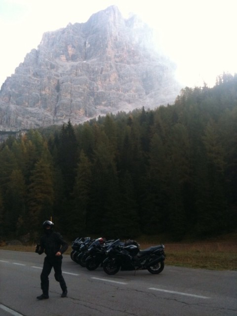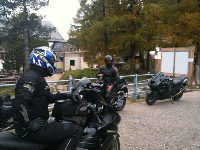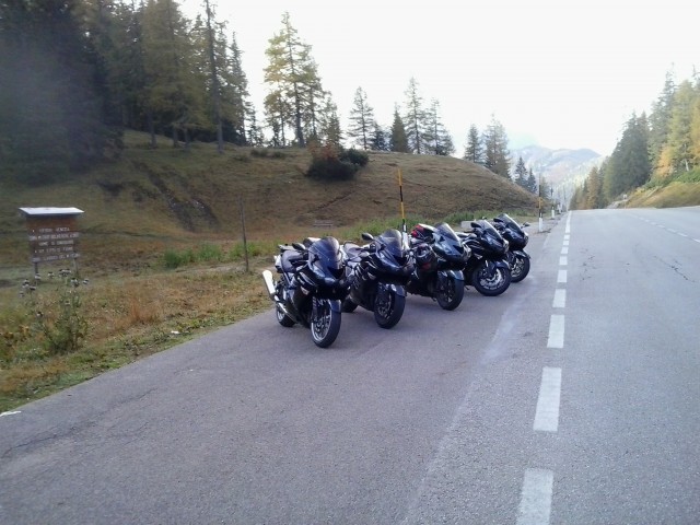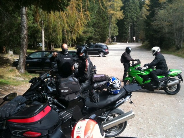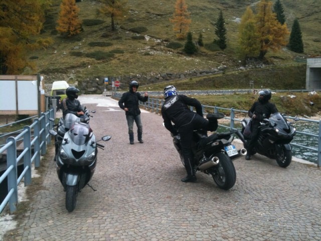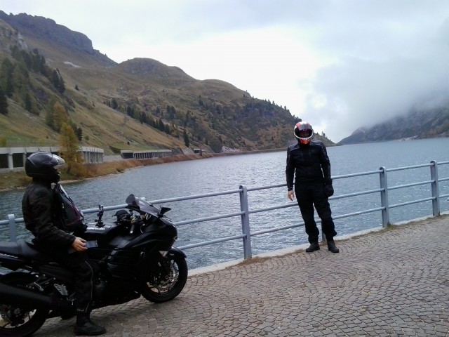 Visto l'avvicinarsi del buio, nonostante la pioggia decidiamo di partire da Longarone, non ci crederete, svoltato il paese e percorsa una galleria, mi fermo, metto le quattro frecce, alzo la visiera, guardo incredulo l'asfalto, incrocio lo sguardo degli altri ed esclamo .... ma e' asciutto, non ha neanche piovuto, neanche una goccia..... incredibile, percorriamo velocemente la strada divertendoci come non poco fino al Passo dove al nostro arrivo comincia a piovigginare.