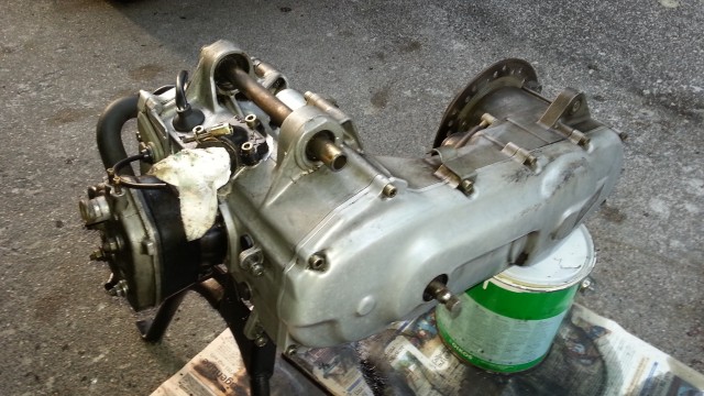 infine, ho pulito il carburatore ma solo con benzina pulita perchè non ho il compressore... sto aspettando che si asciuga e poi faccio un salto da un benzinaio, non so come altro fare...avrei una pompetta che uso per la pulizia di obiettivi e macchina fotografica.. ma non credo abbia potenza sufficiente a far volar via i residui di sporco dalle parti più interne del carburatore. Comunque, ecco come si presenta smontato e pulito: