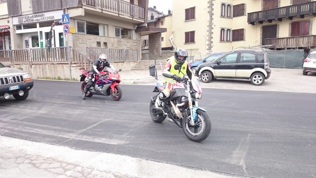 Palle! Ne manca uno...... che e' in giro per il mondo con una moto che e' costata 300 Euri piu' della mia.... ed allora non resisto nel saluatarlo a fare un bel po di fumo con le gomme in mezzo al piazzale...