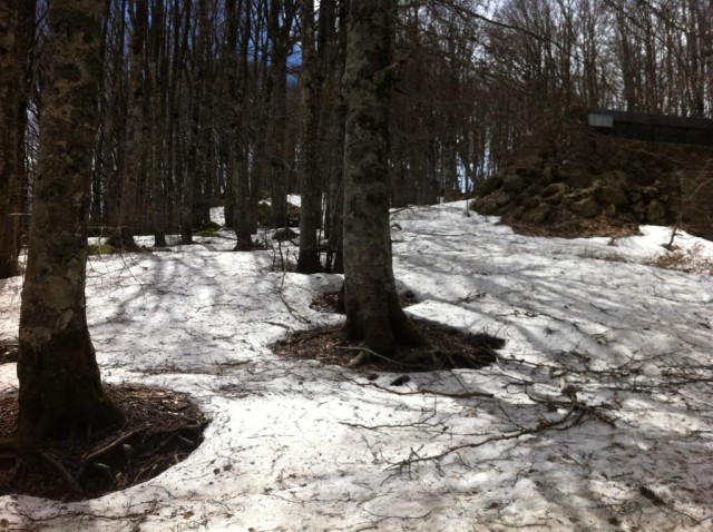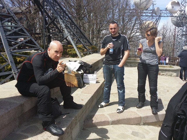 La fame è davvero tanta (ci siamo già fatti 4 ore in sella e oltre 230 km tutti di filato... ) e quindi consumiamo con una discreta rapidità il nostro pranzo al sacco. Un po' di foto, qualche chiacchiera e si sono fatte le 14... È ora di iniziare la discesa... Sulla neve, che sarà più difficile della salita.