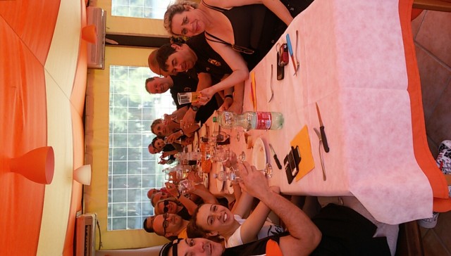 Foto di gruppo finale notare Cesare in arrampicata le foto le carica al contrario girate i cell o i pc tavolata laziali ed emiliani
