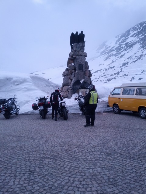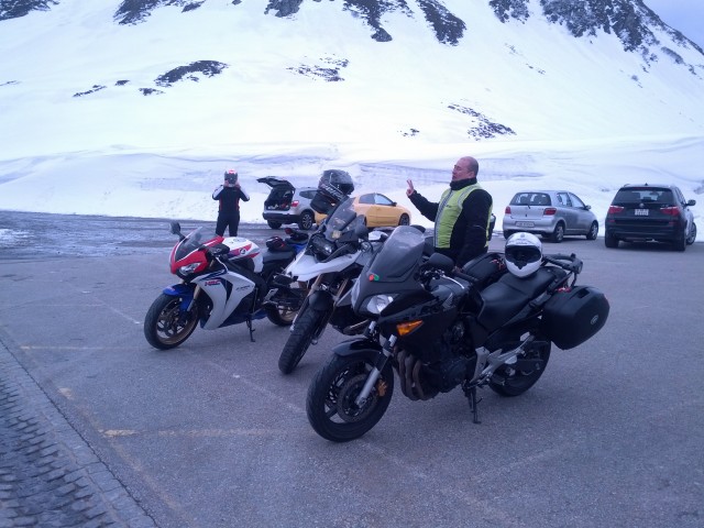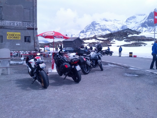Il passo ci accoglie in tutta la sua bellezza, strade perfette e clima ottimale. Le curve e i tornanti scorrono veloci. Nonostante l'andatura turistica riesco comunque a togliermi qualche piccola soddisfazione tirando qualche marcia del panzer tedesco. Un po' di terra prima di un tornante mi ricorda di ringraziare San Brembo e San ABS una volta arrivati in cima al passo; il panzer tedesco in velocità è agile come una gazzella, in frenata un po' meno, diciamo che i 250kg si sentono TUTTI rispetto alla Shiver