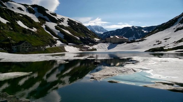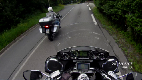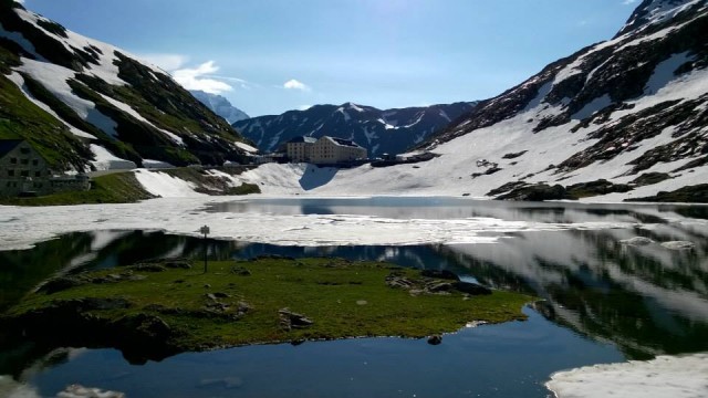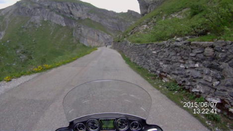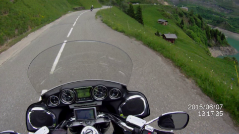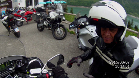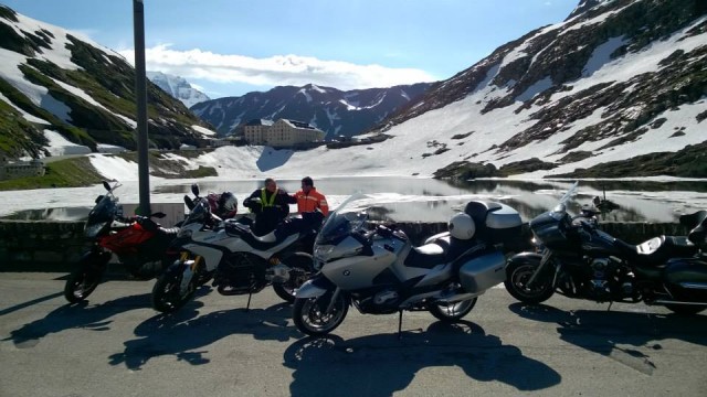 La strada è stupenda e comincia a tirare, io con la mia 2a virtuale, faccio strada a Federico e Francesco che subito s'involano, io debbo tenere il passo a cui sono condizionato e sarà cosi per tutto il giro, ma mi diverto lo stesso. Dopo il primo tratto la vista si allarga, la strada s'inerpica, curva e contro curva, traffico inesistente, temperatura frizzante, cielo sereno, qualche piccola nuvoletta. Cominciano a vedersi chiazze di neve, la vegetazione arborea scompare, si comincia a percepire la sensazione della quota e......il paesaggio è bellissimo. Ma devo far notare un particolare, importantissimo a chi fa del turismo in moto. Al contrario dei passi alpini nostrani, parlo di quelli lombardi in particolare, di quelli svizzeri che troviamo subito dopo il confine, caratterizzati da ripide salite condite da un cospicuo numero di tornanti, qui siamo in val d'Aosta, così come la controparte dell'alta Savoia, si sale in linea, con curve si, ma con pochi tornanti, non ho detto che non ci sono, ma sono sensibilmente di numero inferiore, cosi da caratterizzare una guida più fluida e gratificante...vero Federico...! Io me la prendo comoda, è la prima volta che salgo il gran san Bernardo e me lo voglio godere. Veramente non smentisce le aspettative, anzi di più. Giungo sul valico che gli altri avevano già finito un paio di mani a tre sette, Lo hanno aperto solo venerdì mattina ed è semi deserto. Chiacchiero con Valer mentre Federico e Francesco fanno incetta di foto,...io no, tanto ho la cam,...sborone, impara ad usarla !