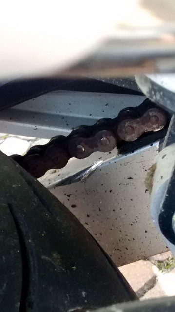 Colpa mia, e scarsa manutenzione del precedente proprietario hanno fatto si che la catena fosse talmente molle e poco lubrificata da grattare via un bel pezzettino del forcellone.