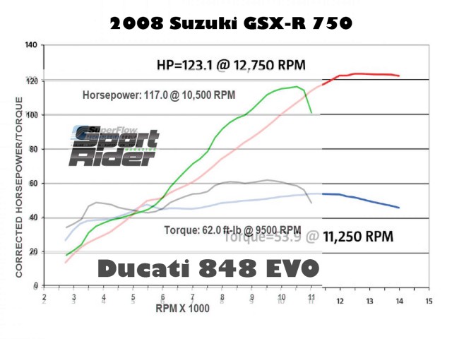 Lettura: verde e grigio sono potenza e coppia Ducati, rosso e blu sono potenza e coppia GSX-R 750.
