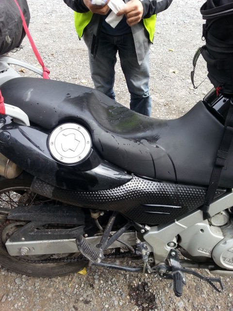 ), e partiamo. La strada giusta è nella direzione opposta ma c’è uno spartitraffico, così percorro un centinaio di metri per fare inversione e torno indietro fermandomi al semaforo che è proprio di fronte l’hotel da dove siamo partiti e dove mi è caduta la moto. Il semaforo è rosso, così ne approfitto per prendere dalla tasca gli occhiali da sole. Nel prenderli aggancio con i guanti un piccolo accessorio del casco che avevo in tasca che cade a terra. Dato che era di plastica, se avessi accostato la moto per recuperarlo lo avrebbero pestato e rotto. Decido che il rosso durerà in eterno e metto la moto sul cavalletto laterale per scendere. Peccato che nella caduta precedente il cavalletto era leggermente rientrato così, convinto di averlo abbassato scendo dalla moto che, indovinate un po’…