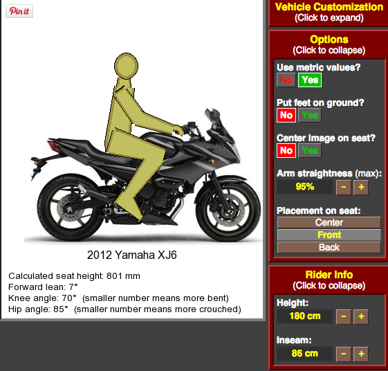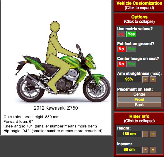 ..per fare un esempio vi dico che utilizzando lo stesso tool e mettendo lo stesso motociclista su un varadero 1000 (non mi dite che non è abitabile) l'angolo delle ginocchia è di 82° mentre quello del busto di 81° e la piega in avanti di 6°...