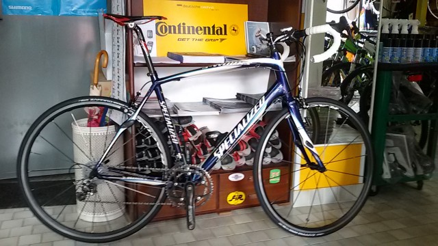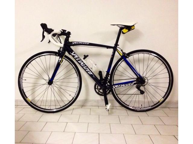 Specialized Allez S-works del 2015 colorazione Contador...telaio in alluminio, forcella in carbonio, perdonatemi ma non ricordo nè ruote nè cambio (mi pare abbia due marce davanti e 10-11 dietro, mi diceva il negoziante con una rapportatura adatta all'uso in collina).