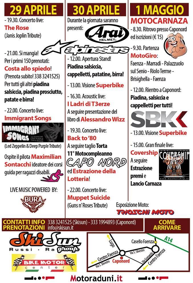 3 giorni di festa con tante novità: stand gastronomico,musica dal vivo, espositori, estrazione primi, motogiro, visione gare SBK, e tanto altro tutto presso CapoNord Faenza .. vi aspettiamo