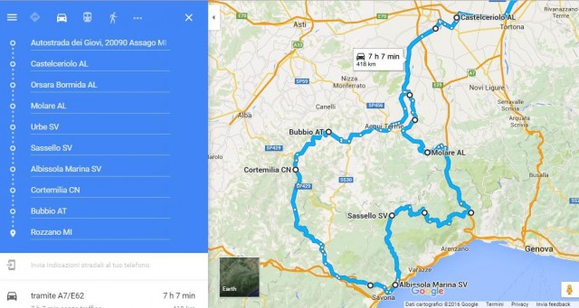 Dopo di che si riparte passando in zona Savona e si punta verso il Piemonte, altre strade tortuose verso Cortemilia e via, si ripunta verso Acqui Terme e Tortona, e lì ognuno decide come ritornare alla sua dimora