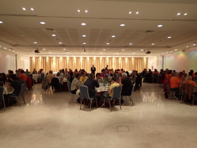 Alla fine ci fanno accomodare nella sala in tavoli da 10. La cena è, manco a dirlo, piuttosto ricca e piuttosto buona.