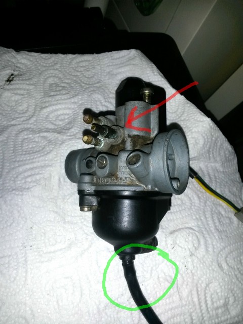 Questo è il carburatore...vorrei sapere cos'è il tubo indicato con la freccia rossa e l'attacco del tubo cerchiato di verde dove so che esce benzina,in questo caso la miscela. Grazie per le risposte