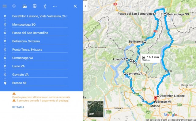Si scende a Bellinzona, Ponte Tresa, si rientra in Italia puntando sul lago Maggiore, Luino, strade curvose, e giù verso il lago di Varese; a questo punto siamo in dirittura di arrivo, ritorno direzione Milano.