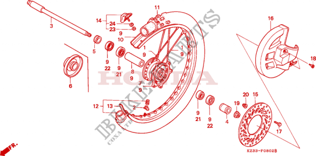 Rispetto all'esploso che hai postato tu questo che ho trovato in rete mostra che li in mezzo vi siano più pezzi come ad esempio i collarini dei distanziali... confrontando i codici del ricambio dei vari modelli delle varie annate della serie CR sembra che ci siano quasi in tutte misurano 8 mm ciascuno, come misura che ti manca per arrivare a chiudere potrebbe starci 16 mm in totale per arrivare a battuta? perchè secondo me l'unica soluzione e che quando hanno smontato la ruota per caricare la moto sul furgone si sono persi qualche pezzo...