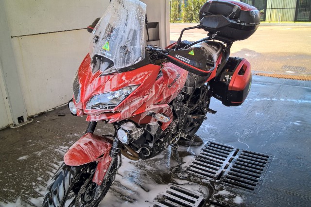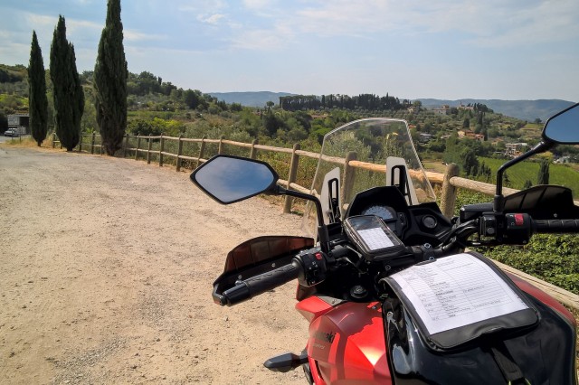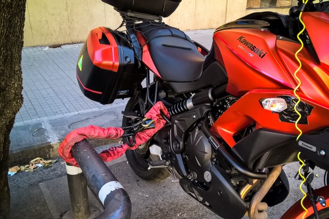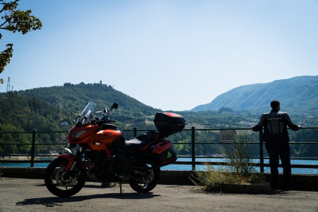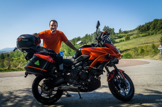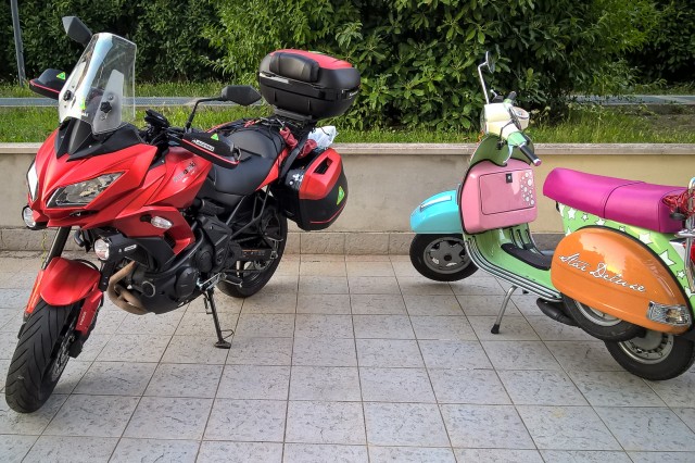 L'assetto da viaggio è abbastanza semplice, una borsa con i ricambi per me, una borsa con le cose per la moto e uno zaino con mappe, snack, fotocamera. Casco, abbigliamento tecnico e protezioni varie, che non si sa mai