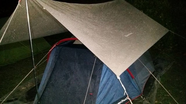 Telo impermeabile con tiranti e possibilmente pali da usare tipo tarp;
