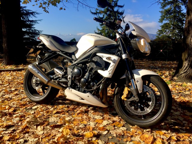 La mia moto è un ,Triumph street triple R del 2011 bianca, apparecchiata con uno scarico Zard basso.