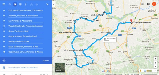 Ho scelto un punto di partenza come Mortara (PV, a 15 km da casa mia - Garlasco), nel piazzale di un supermercato Lidl, perchè mi sembra ben raggiungibile da Milano, Vercelli, ecc., quindi ho scelto le colline del Monferrato perchè ci sono stato domenica scorsa, e ci sono strade veramente belle, sinuose, poco traffico, bei panorami, che mi sembra ottimo per cominciare la stagione. Poi il giro si snoda fino a lambire l'appennino ligure (zona Bubbio-Acqui Terme), fino a raggiungere l'alessandrino e Castelnuovo Scrivia dove, a dire il vero, non c'è un gran che, ma l'ho scelto sempre per questioni logistiche: da qui si può prendere l'autostrada per rientrare verso Milano o verso Pavia, Vercelli, ecc.