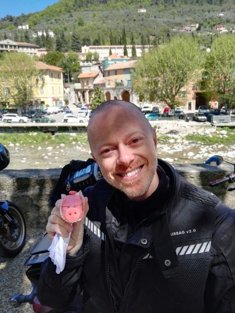 A Sospel, parcheggiamo nei pressi del muraglione sopra la riva del fiume: finalmente capisco perché Veleno mi ha sorpassato, poco fa, per poi piantarmisi davanti... è il regista della situazione ed ha montato una telecamerina minuscola sulla coda della sua moto!