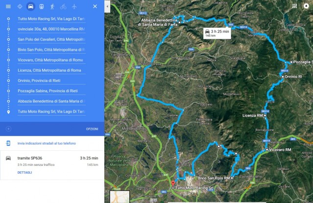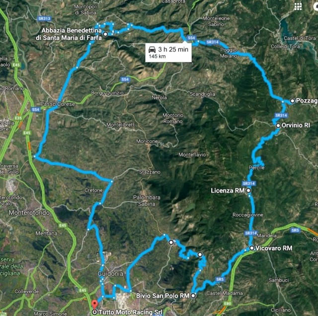 Partendo dal TMR entriamo dentro verso Cretone, poi Marcellina, San Polo dei Cavalieri, si scende sulla Tiburtina fino a Vicovaro, si prende la Licinese, si passa per Orvinio (speriamo di riuscire a vedere anche l'infiorata), si scende a Pozzaglia, Turano, e poi tutti con le gambe sotto il tavolo (davanti al ristorante c'è un piazzale dove spesso si riuniscono per raduni motociclistici), e poi dopo pranzo si va a visitare l'Abbazia!