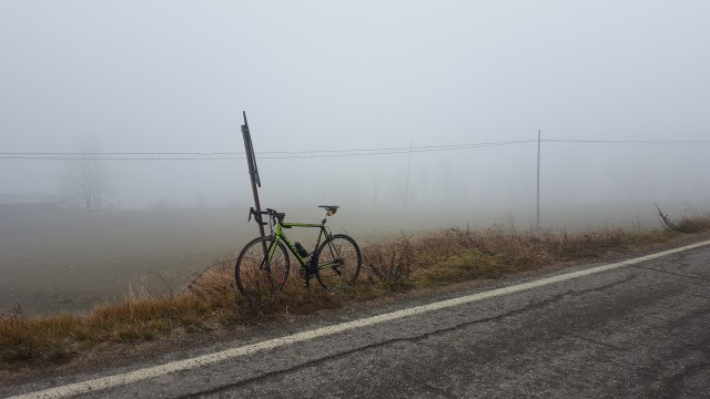 io invece ier mattina ho dovuto pedalare in una deprimente nebbia...scelte strane del gruppo. Quando sarebbe stato sufficiente salire appena qualche centinaio di mt per lasciarsi il nebbione sotto, si è deciso di rimanere a valle