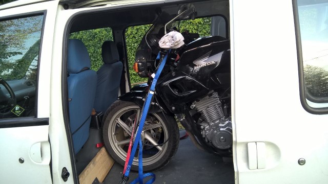 Dovendolo usare anche come mezzo di trasporto quotidiano, ho scelto un furgone molto compatto... per questa ragione, volendo caricare due moto stradali dobbiamo optare per le più piccole di casa, ovvero la CB500 e la SV650.